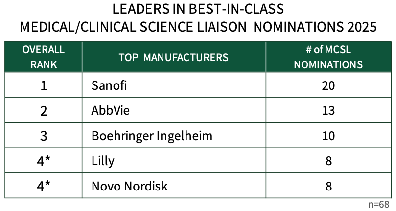 Medical/Clinical Science Liaisons from Sanofi are Most Frequently Nominated as Best-in-Class. HIRC queried 68 commercial health plan and pharmacy benefit manager key decision-makers to learn which firms' medical/clinical science liaisons are best-in-class. Sanofi leads with the most best-in-class nominations from managed markets customers, followed by AbbVie, Boehringer Ingelheim, Lilly, and Novo Nordisk.