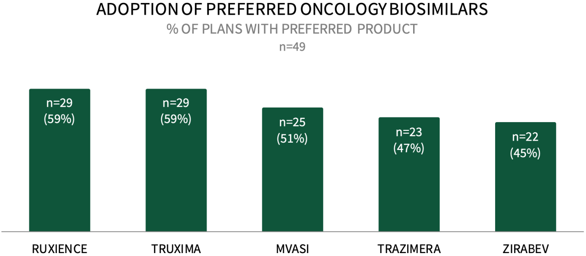 Commercial Payers are Actively Preferring Oncology Biosimilars in 2025. RUXIENCE and TRUXIMA are the most commonly preferred oncology biosimilars among commercial health plans, with roughly 59% of respondents indicating their plan lists these medications as preferred. They are followed by MVASI (51%), TRAZIMERA (47%), and ZIRABEV (45%). The full report examines the status of uptake across 15 oncology biosimilars, and the management tactics used to promote their utilization.
