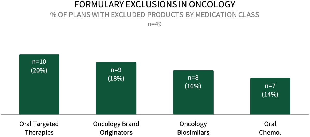 Formulary Exclusions in Oncology. Commercial plans' use of formulary exclusions in oncology remains relatively low. About 20% of commercial health plans say their plan currently exclude some oral targeted cancer therapies from formulary, while another 18% report exclusions for oncology brand originators, 16% for oncology biosimilars, and 14% for oral conventional chemotherapy medications. The full report examines formulary exclusions across nine oncology treatment/therapeutic categories.