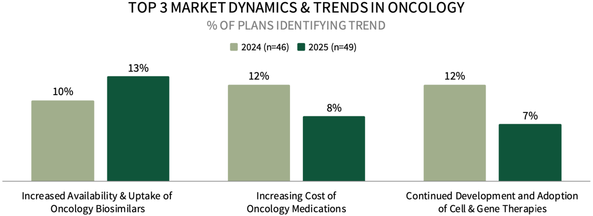 Increased Availability and Uptake of Oncology Biosimilar Medications Among Top Market Trends for Health Plan Leadership. Commercial health plan decision-makers were asked to identify the top oncology-related market trends impacting their business. The top trend identified is the increased availability and uptake of oncology biosimilar medications, followed by increasing cost of medications, and adoption of cell and gene therapies. A greater percentage of plans mentioned the utilization of oncology biosimilars & generics in 2025, compared to 2024.