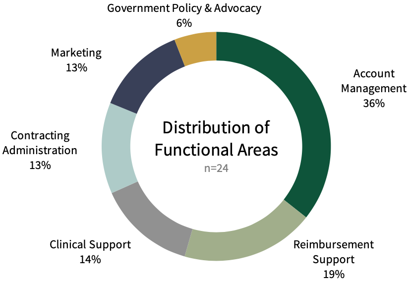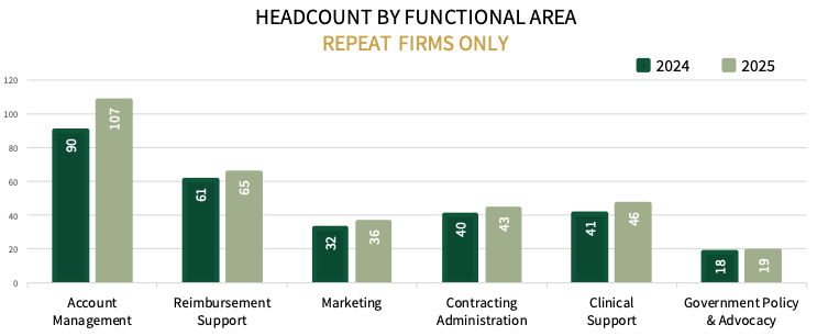 Key Finding: Repeat firm headcount increased by about 13% year-over-year, with notable increases observed in Account Management, Clinical Support, and Marketing. Account Management represents the largest portion of manufacturer headcount.