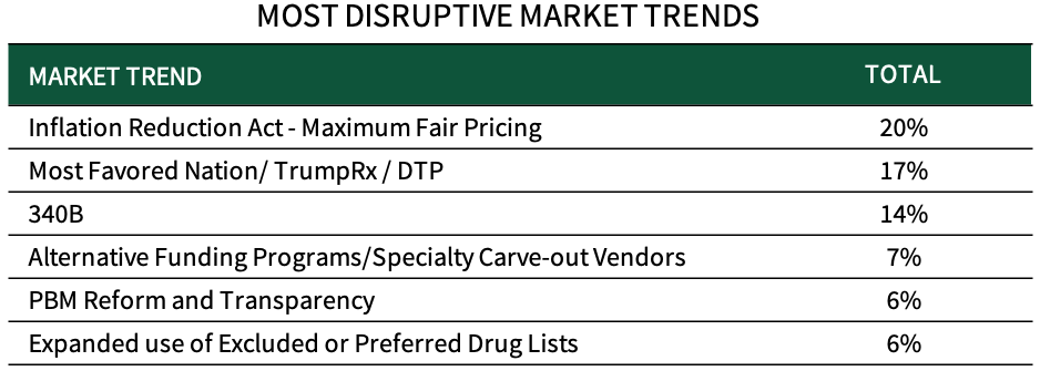 Panelists Identify MFP, and MFN/TrumpRx/DTP as Top Market Trends in 2026. Managed markets respondents from leading pharmaceutical firms were asked to list the top market trends/disruptors with the highest potential to limit access to customers. Respondents identify the Inflation Reduction Act's Maximum Fair Pricing as the top market trend in 2026, followed by Most Favored Nation/TrumpRx/DTP and 340B reform. Secondary trends include alternative funding programs/specialty carve-out vendors, PBM reform and transparency, and expanded use of excluded or preferred drug lists. The full report includes a complete listing of pharmaceutical firms' most disruptive market trends in 2026.