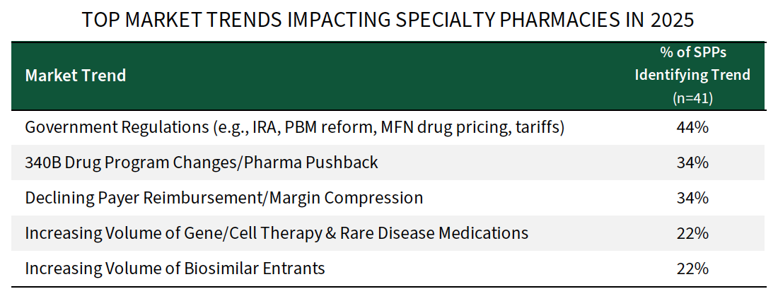 The Unfolding Regulatory Environment is Identified by SPPs as the Top Most Impactful Market Trend for 2025. SPPs report several market trends impacting their industry and businesses in 2025. Topping the list is the rapidly evolving legislative and policy landscape, with the IRA, 340B, new drug pricing laws, and PBM regulations top of mind for SPP decision-makers. This is followed by margin pressures and the increase in gene therapy, rare disease medications, and biosimilars - the latter presenting both challenges and opportunities to SPPs depending on their ownership type and capabilities.
